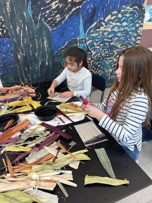 Students in grades 1 through 3 at the Center School in Mattapoisett make weavings using small looms and corn husks that they dyed various colors using natural plant materials, under the direction of Artist-In-Residence Elizabeth James-Perry on Jan. 13 and 14.