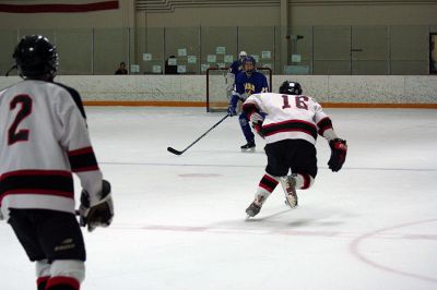 The Old Rochester/Fairhaven Hockey team was just seconds away from a win when they faced Wareham at Tabor Academy on Wednesday, January 21 when the Vikings staged a furious comeback, winning the game 6-5 on an empty net goal as time expired. (Photo by Robert Chiarito).