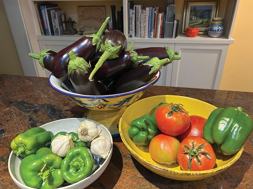 Although I look forward to my own harvest from my vegetable garden, I can always expect that my father will give me some of his, and thus it was after we checked the hive that he gave me several eggplant – “Your mom is finished with them” he said, suggesting that she has her fill of preparing meals with them, no doubt having put them in the freezer. He also gave me several tomatoes, including a new brand “Celebrity” as well as a bunch of green peppers (mine were small in comparison) and a handful of garlic cloves.