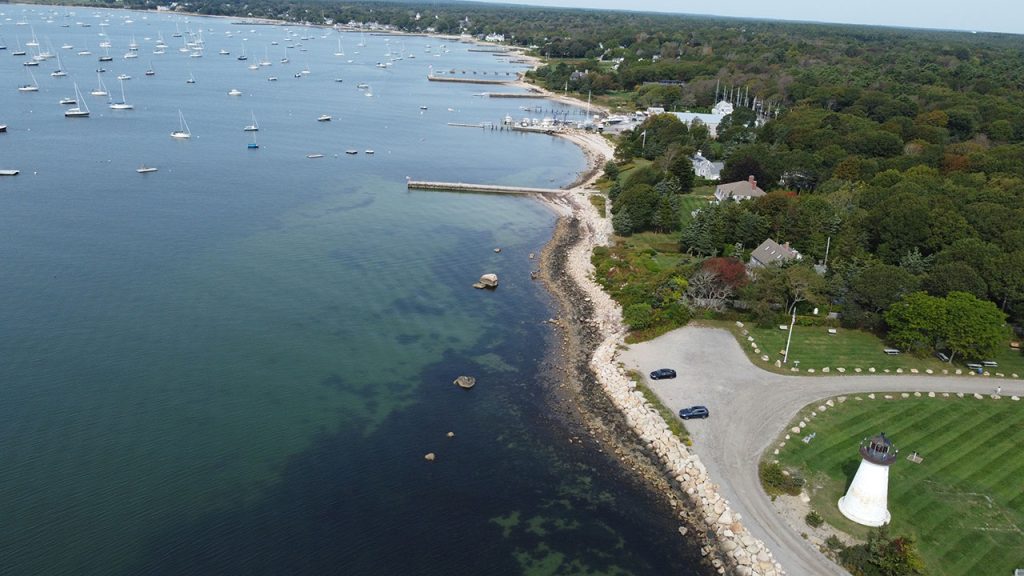 A shot down Main Street. You can see the Town House, currently being renovated, the back of the Elizabeth Taber Library, some of Sippican School, and the harbor in the background with many boats still moored.