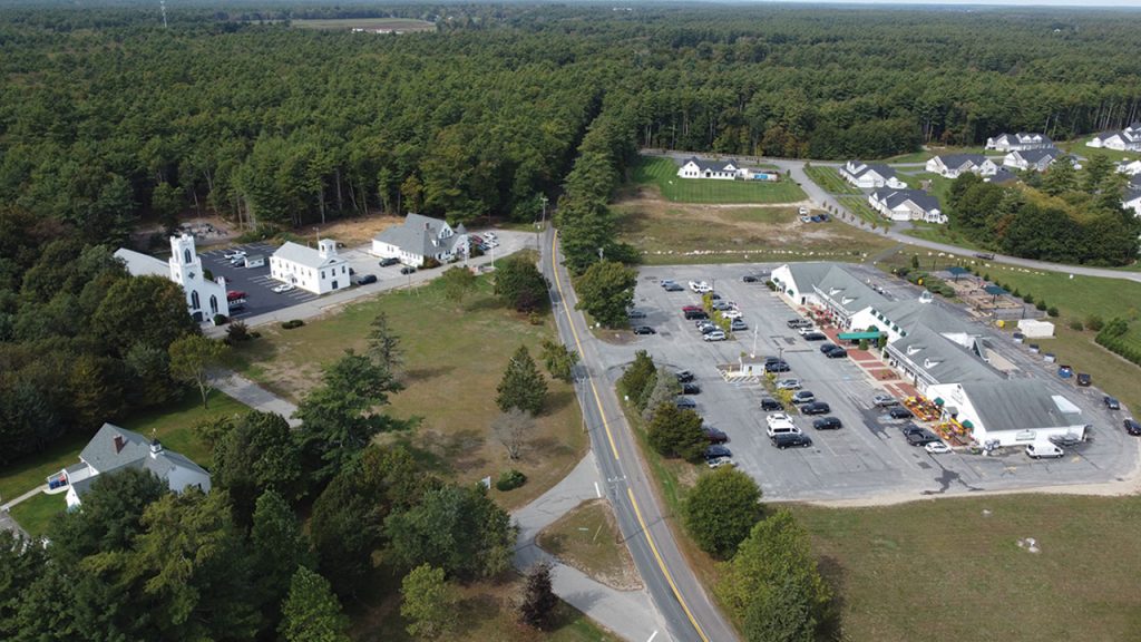 Above Plumb Corner with Friends Market to the right and Town Hall and the First Congressional Church to the left.