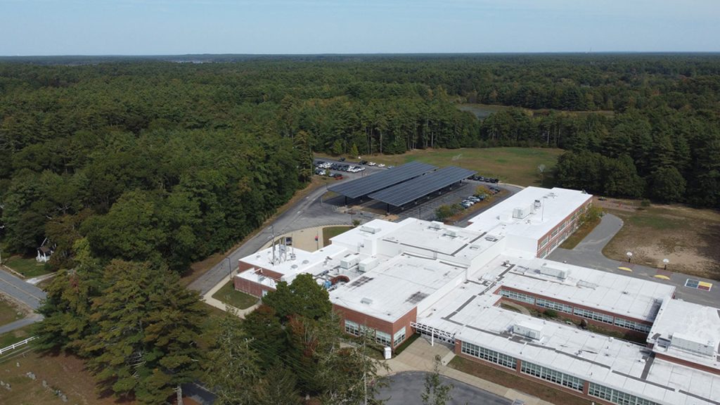 Rochester Memorial School’s nearly completed solar array built atop their rear parking lot.