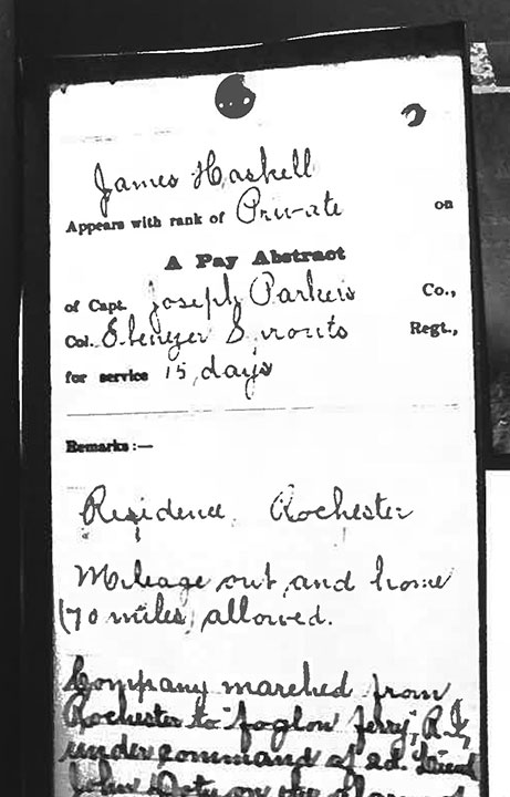 The lists of Rochester’s Revolutionary soldiers contain the names of Elnathan Haskell, Elnathan Haskell, Jr., James Haskell, and Nathan Haskell along with twelve others that share the same surname. Looking at the elder Elnathan’s family tree, we know that at least three of his and Dorothy Peckham Haskell’s sons fought in the Revolution.